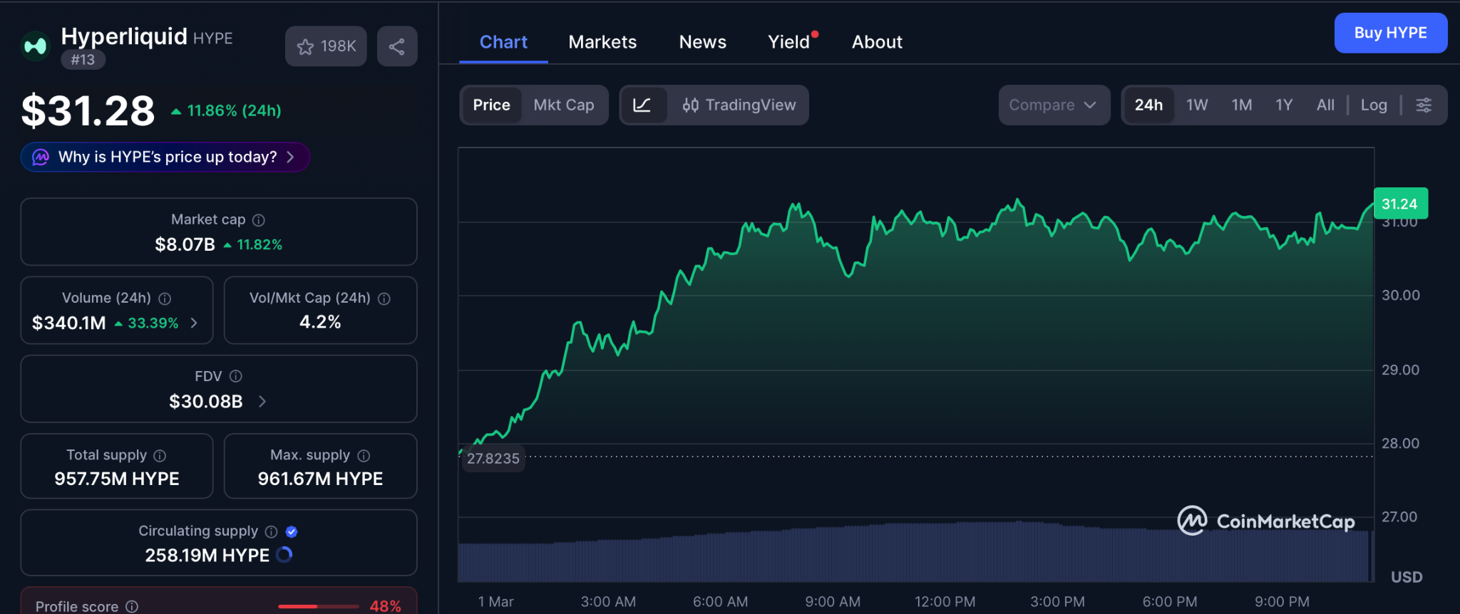 Hyperliquid wird laut CoinMarketCap für rund 31 $ gehandelt, nachdem er 54 % von seinem Allzeithoch von 59,30 $ gefallen ist.